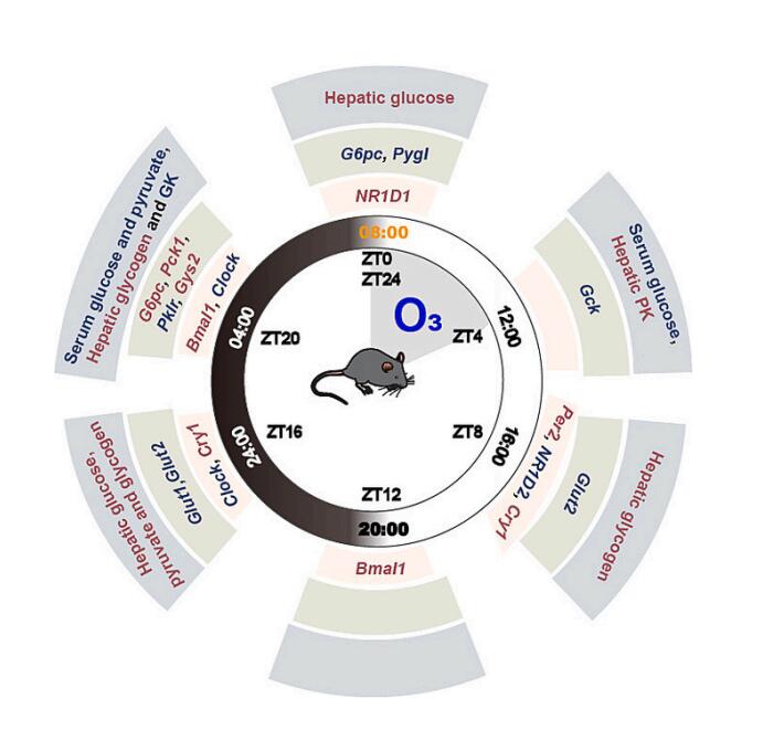 先前的研究發現,Bmal1或Clock基因敲除小鼠出現低血糖、糖耐量受損和胰島素敏感性降低(Marcheva et al., 2010;Rudic et al., 2004)。負調節因子Per2和Cry也被證明對維持葡萄糖代謝穩態至關重要(Doi et al., 2010;Froy, 2010;Yang等人,2009)。此外,越來越多的證據表明,生物體對外源物質的反應可能會破壞其自身的晝夜節律,并導致一系列不良后果(Prokkola和Nikinmaa, 2018)。3,3 ' 4,4 ', 5-五氯聯苯(PCB126)和環境細顆粒物(PM2.5)等環境污染物不僅會損害小鼠肝臟的晝夜節律振蕩,還會導致糖脂代謝紊亂(Li et al., 2020;Shen等人,2019)。鑒于肝臟自主生物鐘在維持肝臟糖脂代謝穩態中的重要作用,o3誘導的糖代謝改變是否與晝夜節律有關還有待驗證。